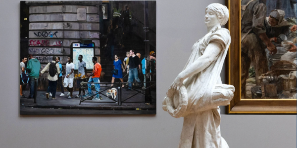 C’est en voyant des photos sur Insta que j’ai eu envie d’aller voir cette expo : Paname de Bilal Hamdad. On y voit des peintures à l’huile assez monumentales qui représentent des scènes de vie contemporaine parisiennes : des jeunes en terrasse, une femme dans le métro ou encore des portraits. Rien de spectaculaire à première vue et pourtant j’ai été happée par ces images et j’ai eu envie d’aller en voir plus.
